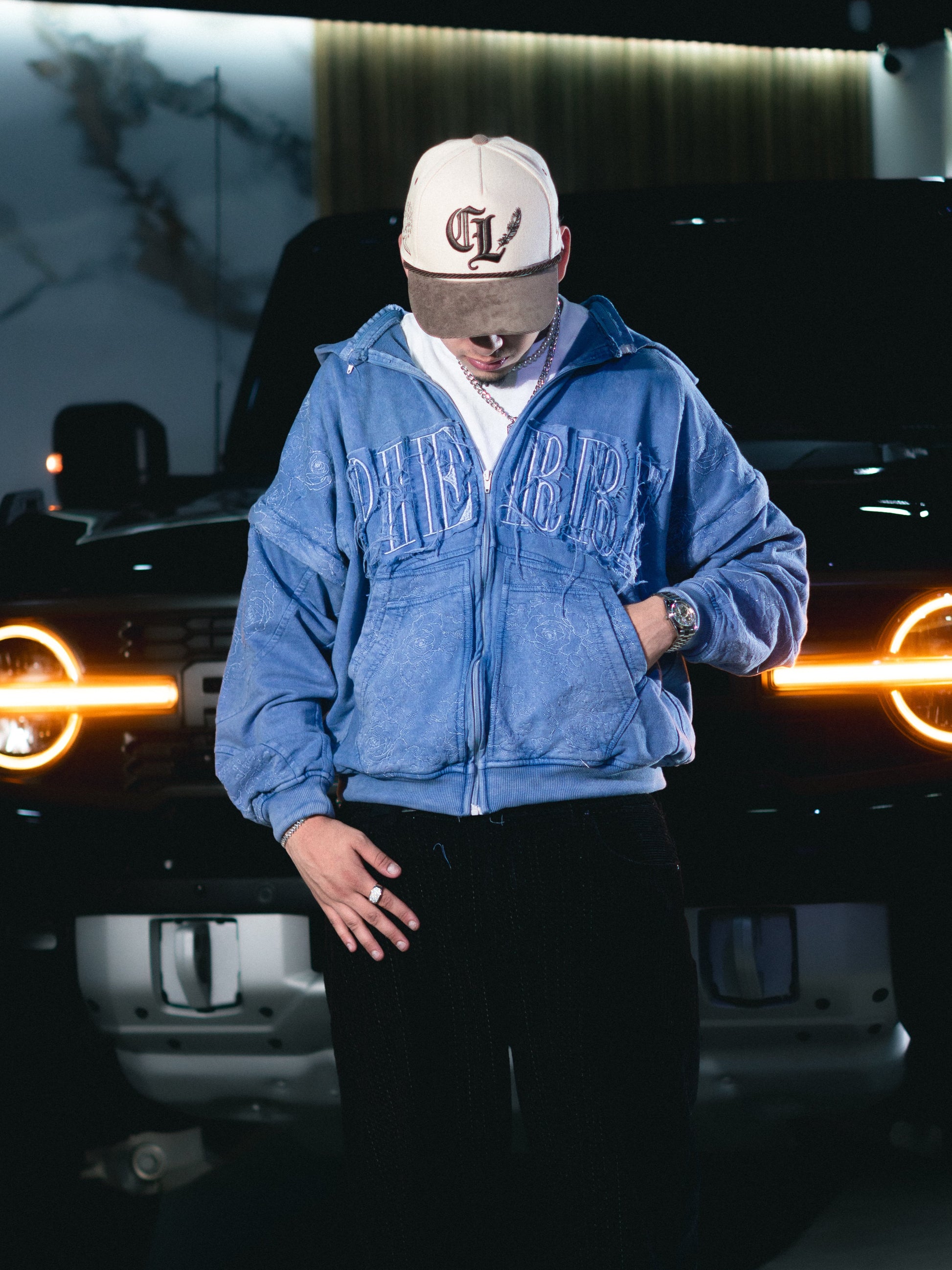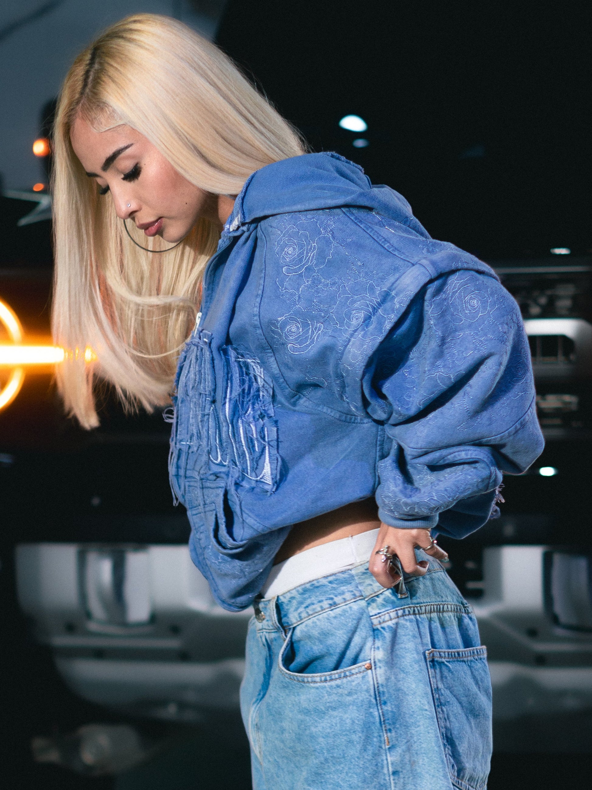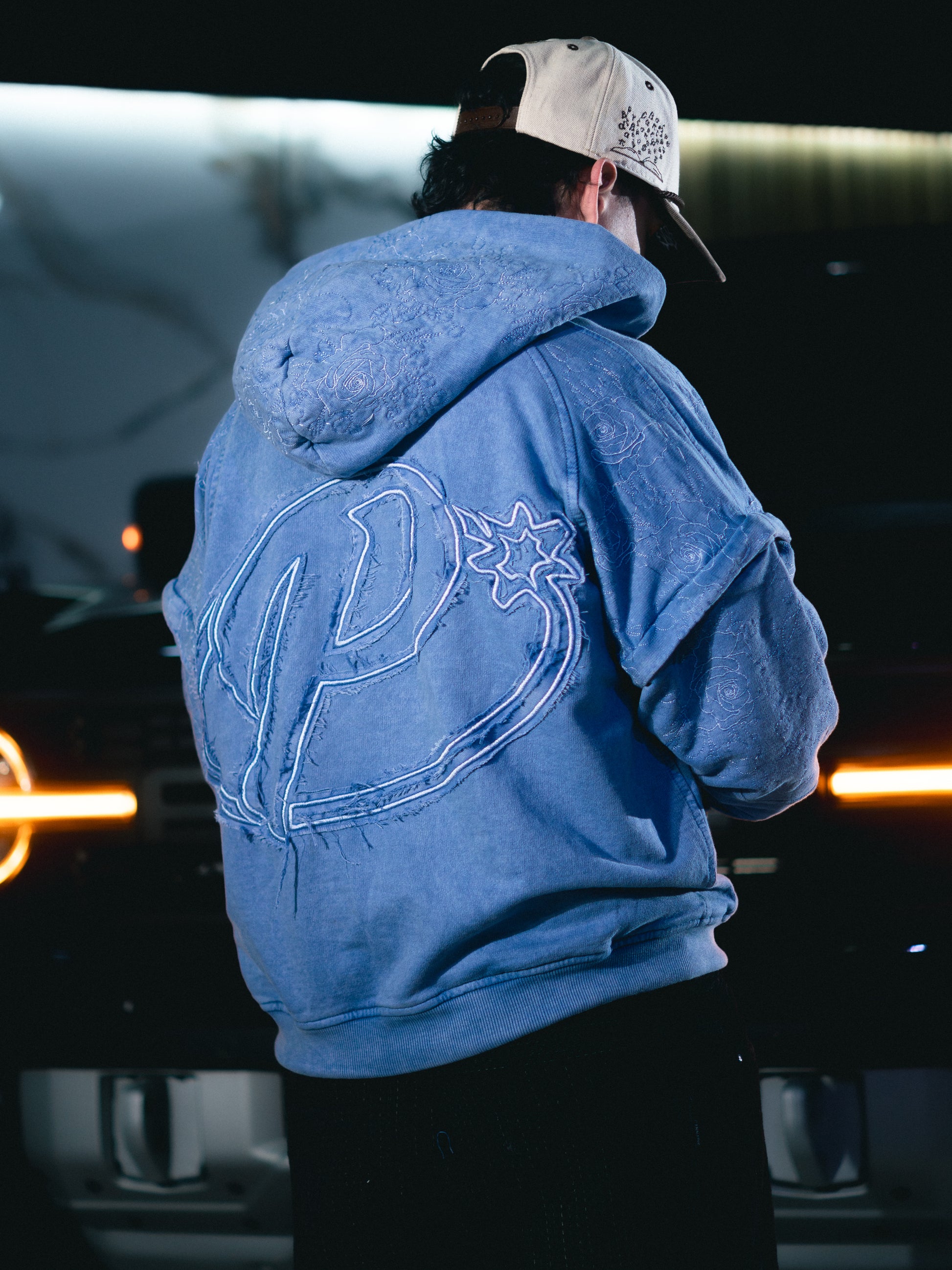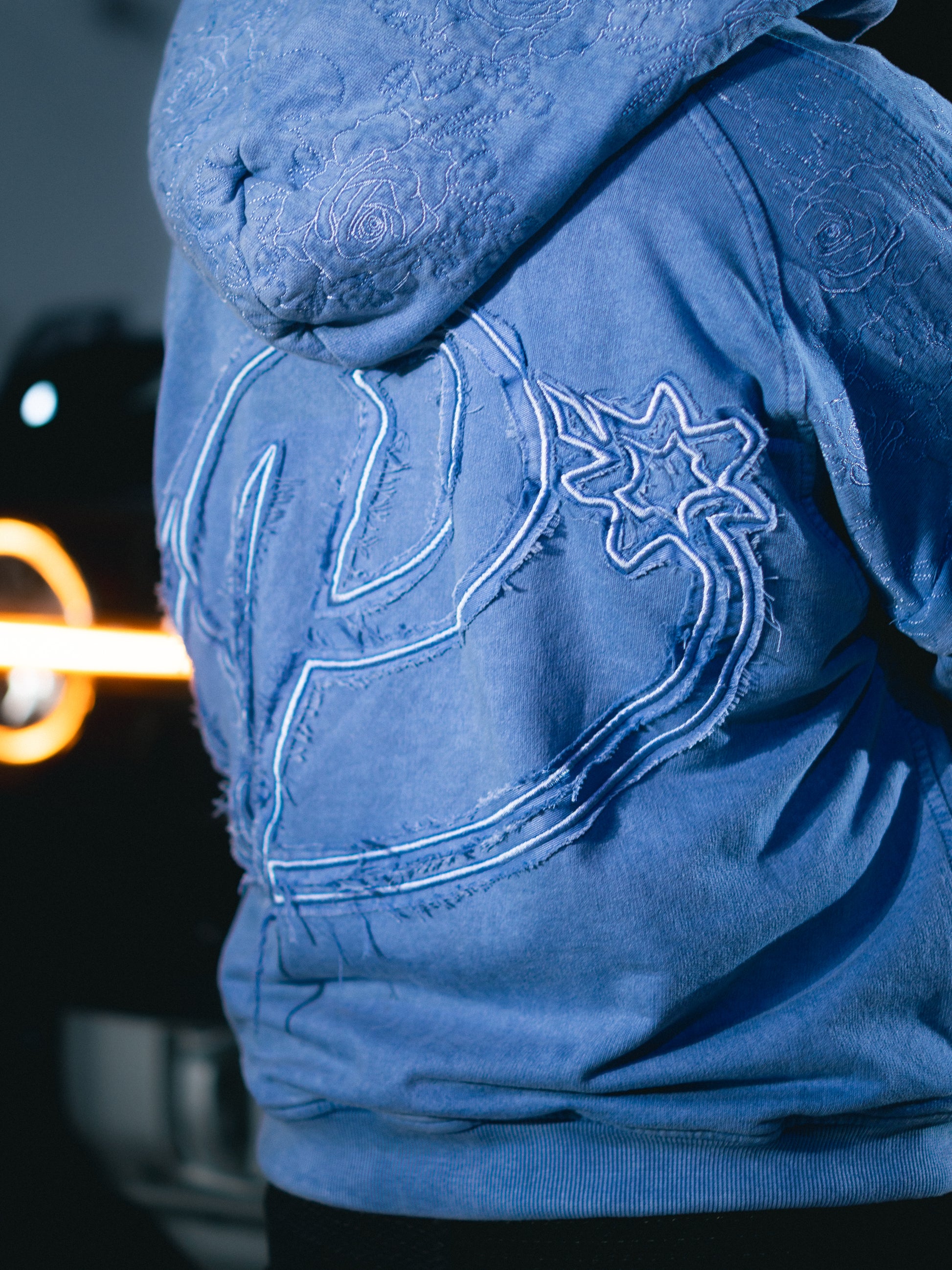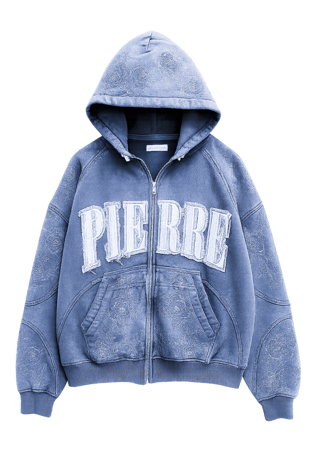 Hoodie de cierre color azul desgastado.